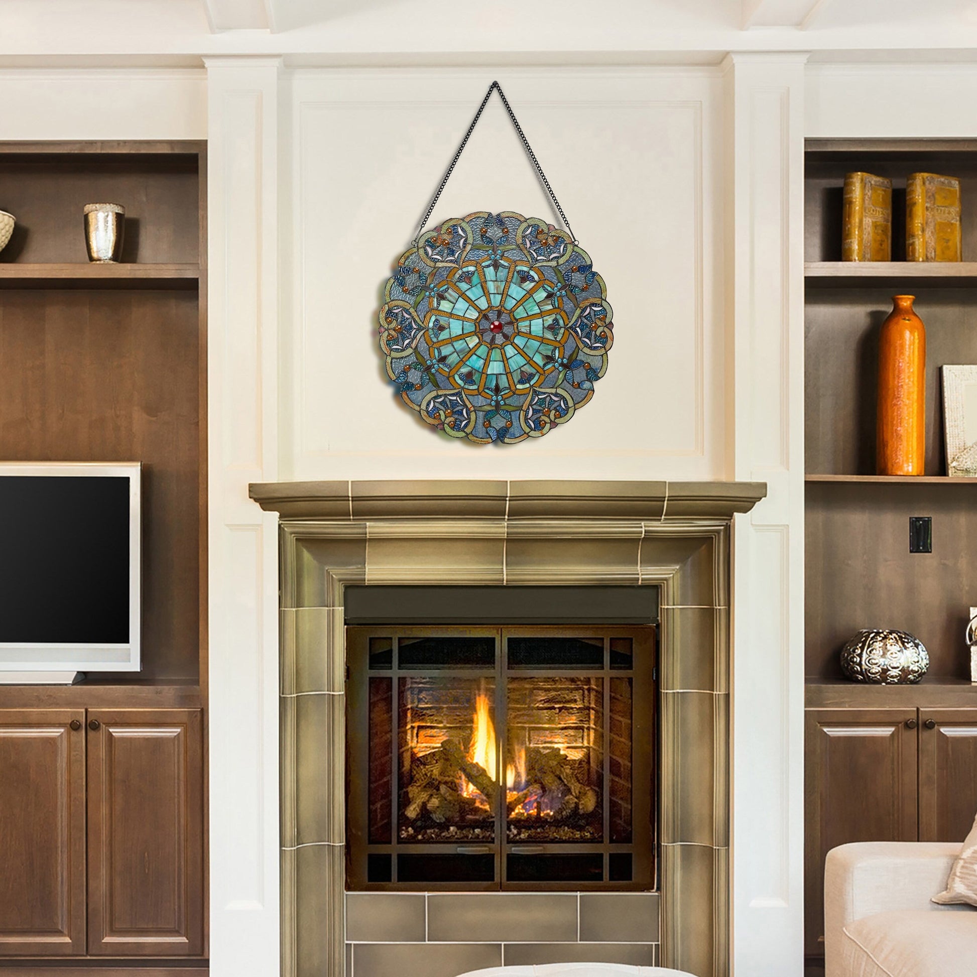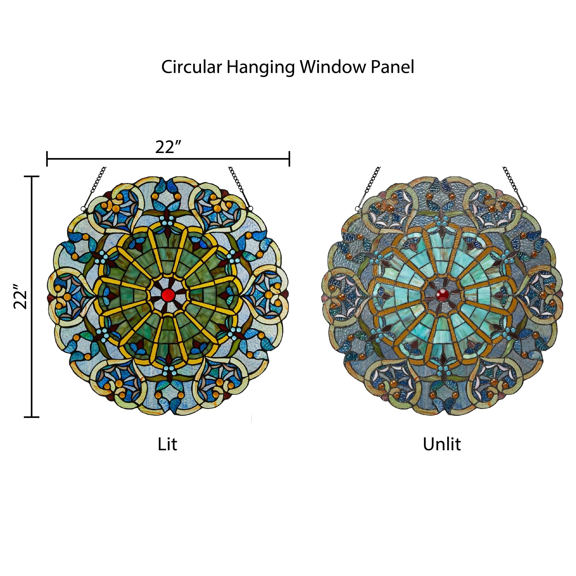 Add a touch of tradition and elegance to any room with this 22-inch Victorian-inspired stained glass window panel. Showcasing a stunning webbed heart design in rich shades of blue, this panel is a real conversation starter. Made from handcrafted stained glass, it captures and reflects the light beautifully, creating an enchanting play of colors when placed in a sunny window. It comes with a 30-inch hanging chain for easy installation. The panel is easy to clean, requiring only a damp cloth or lemon oil polish and a soft, dry cloth to retain its vibrant colors.
