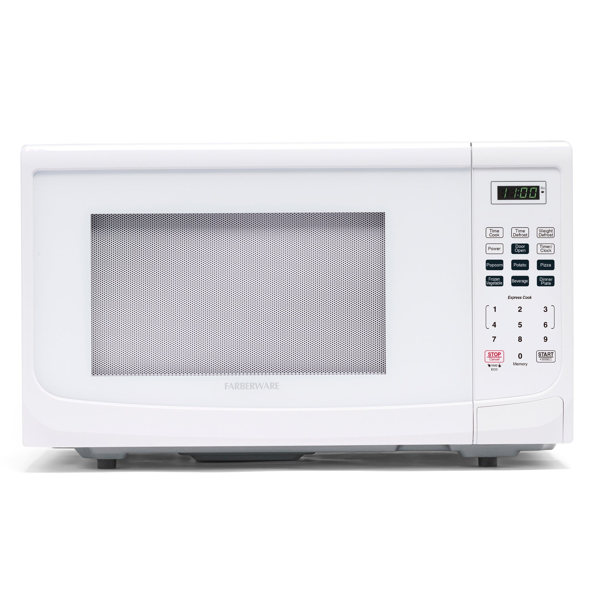 This Farberware 1.1 Cu. Ft. 1000-Watt black microwave oven is the ideal size for office break rooms or smaller kitchens. 6 ONE touch cooking programs lets you optimally cook six of the most popular food items with the touch of a button. Choose from ten power levels up to 1000 watts on this countertop microwave ovens. The large digital screen has a clock feature and can display a countdown timer in addition to the cooking time remaining. The memory function let you customize and save your favorite cook settings for added one-touch benefit. Quickly open or shut the microwave oven with the large, easy-to grip door and the child safety lock function provides an added level of security. The black exterior looks great in any type of cooking area. The small microwave can be activated for one to six minutes at 100 percent Power by just touching one of the express cooking buttons. If added cooking time is needed while the compact microwave is running, press the 30 second plus button to add an additional cooking time.