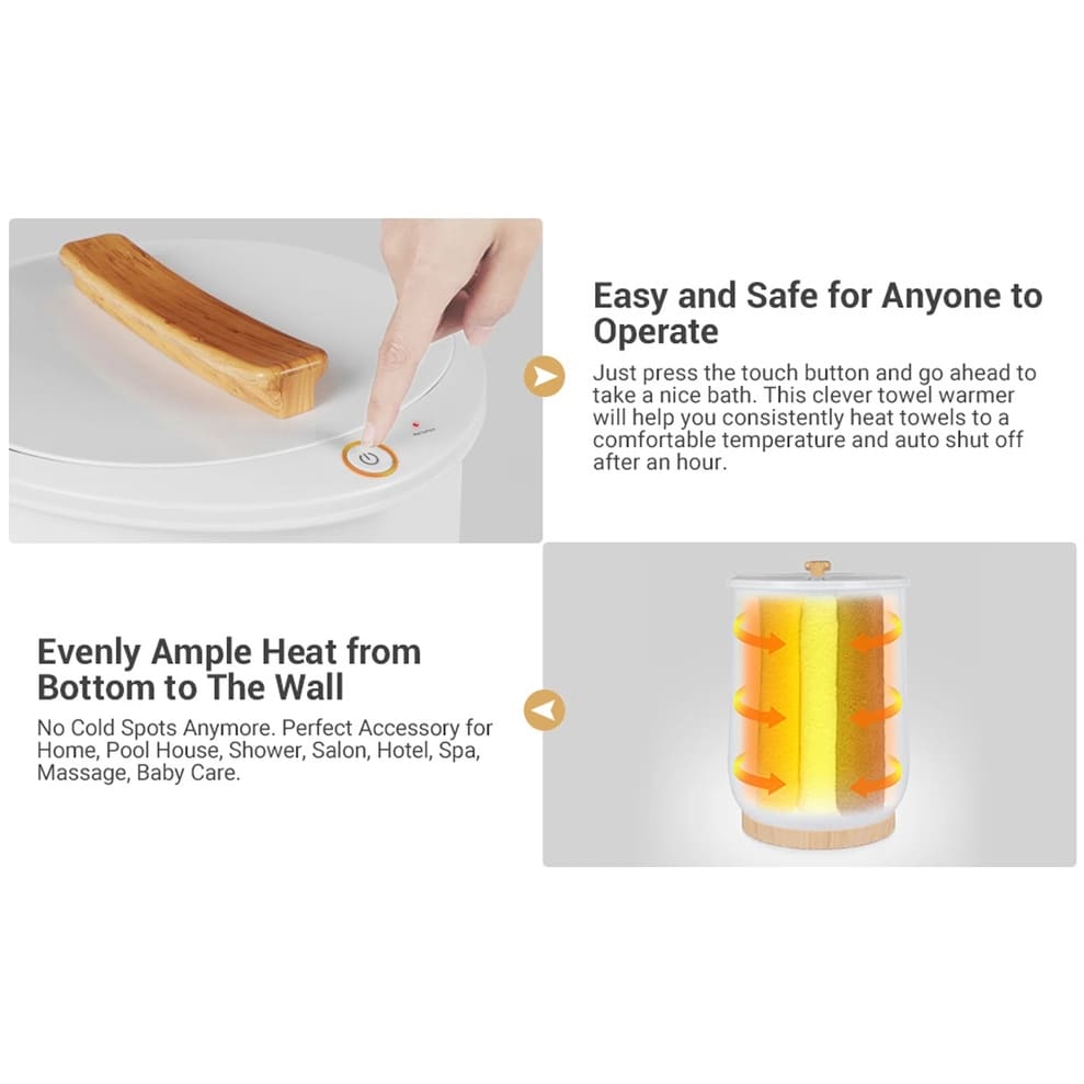 - 【1-Minute Rapid Heating】Super simple operation. Just put your dry towels in and press the one single sensitive touch button control before bathing. After 1 MINUTE, the towels will get quick heat. After 6 MINUTES, the temperature will up to 122℉and will continue up to about 266℉and keep the warm in an hour. This towel warmer will shut off automatically for safety after an hour. After bathing, you can use the warm towel immediately, enjoying the comfortable spa experience at home!