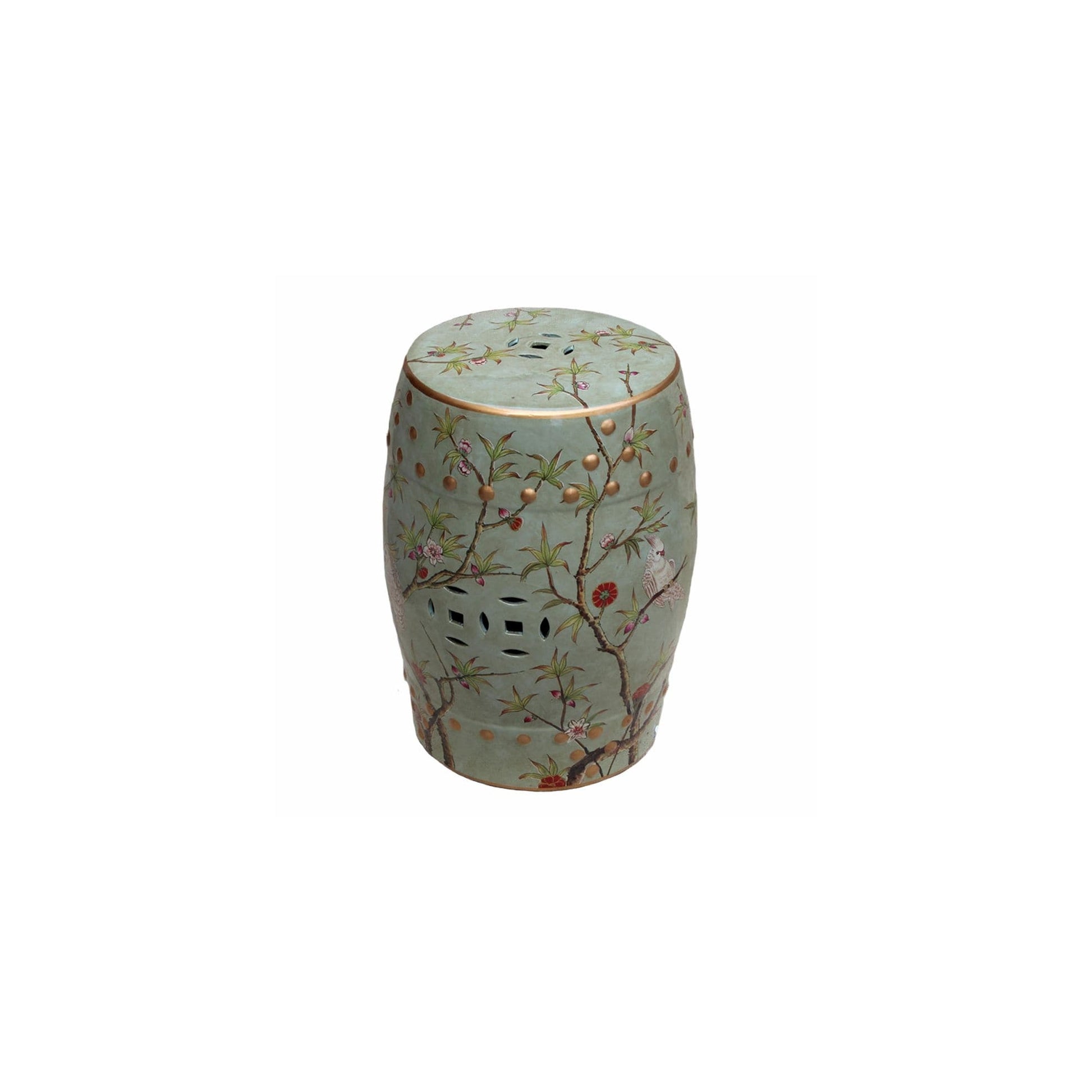 Add a touch of elegance and functionality to your outdoor area with this Handmade Famille Porcelain Stool. Made from smooth porcelain, this decorative stool features an intricate botanical-themed design with gold, green, and red tones that give it a beautiful appearance. Perfect for your patio or balcony, this hand-painted stool is a versatile seating option that will elevate the look of your space.