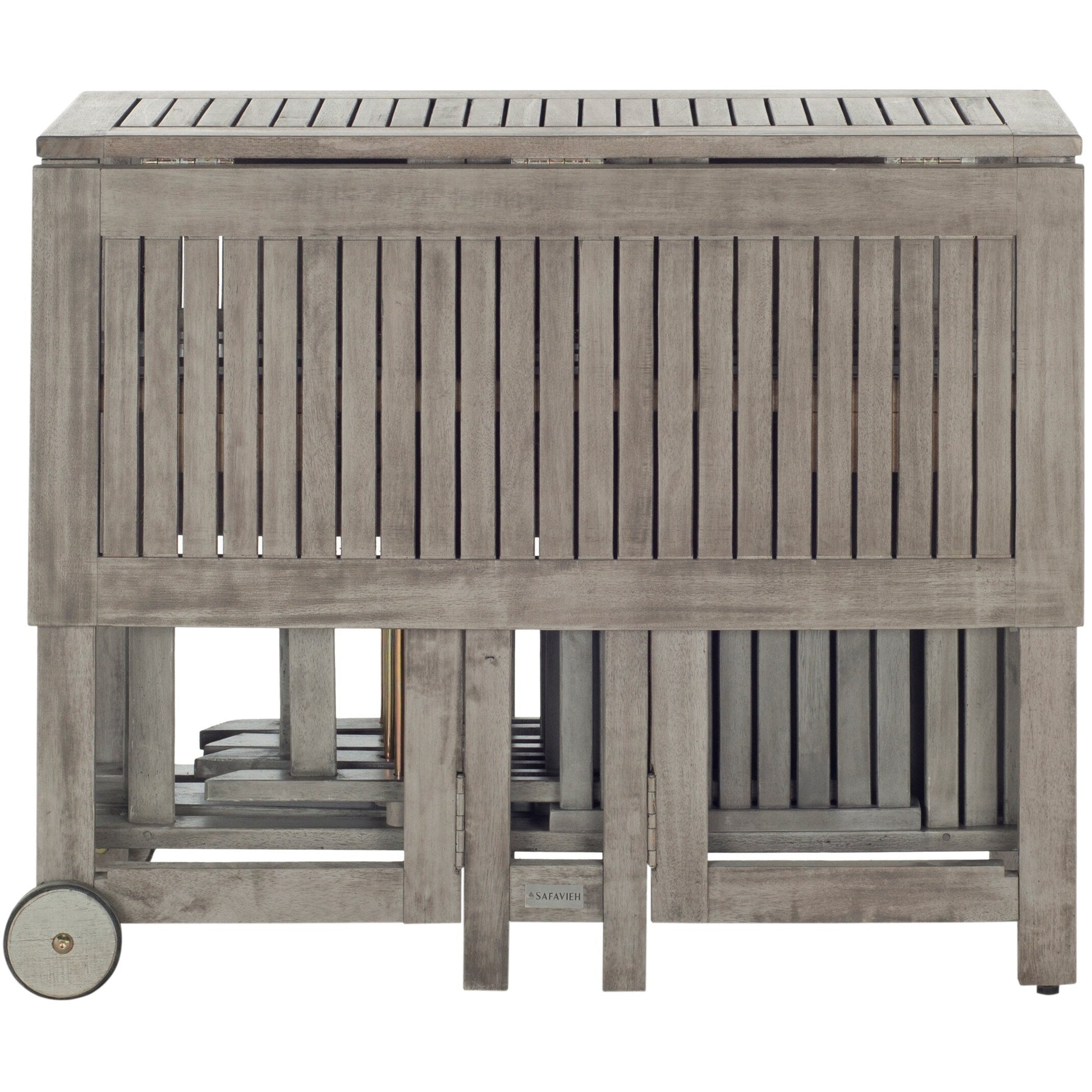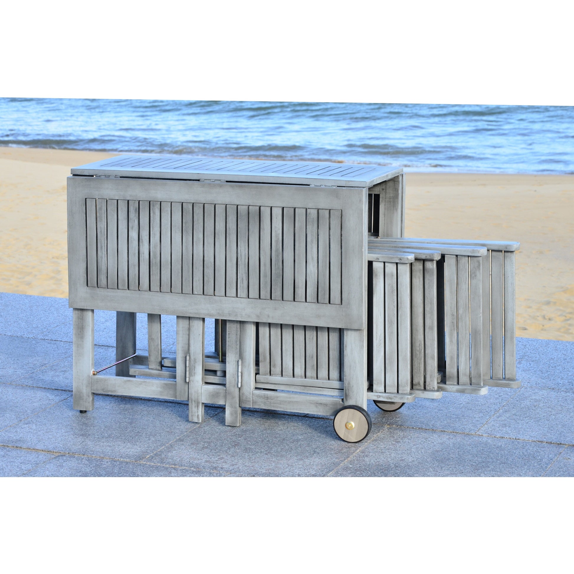 An ingenious space saver, outdoor dining table and chair set is designed for gracious outdoor living. Crafted of eco friendly acacia wood in , its 4 director style chairs fold and tuck under a foldable rectangular table for easy storage.